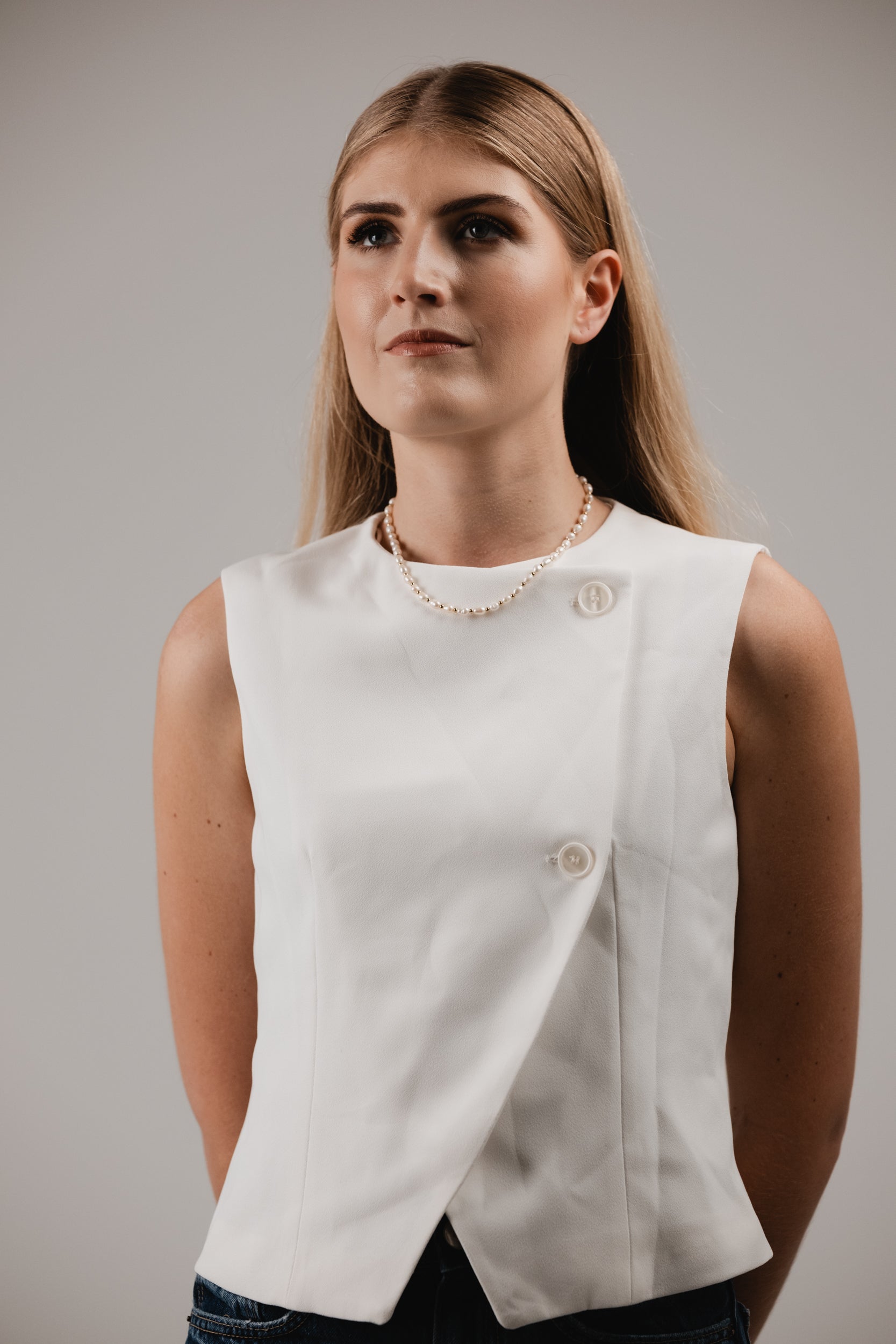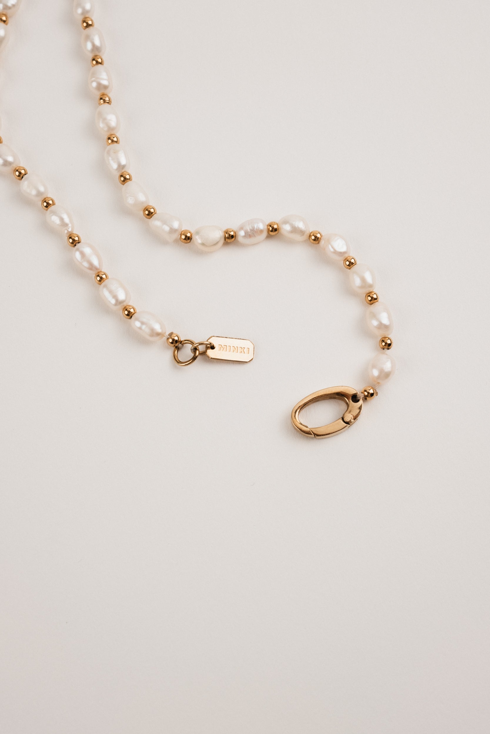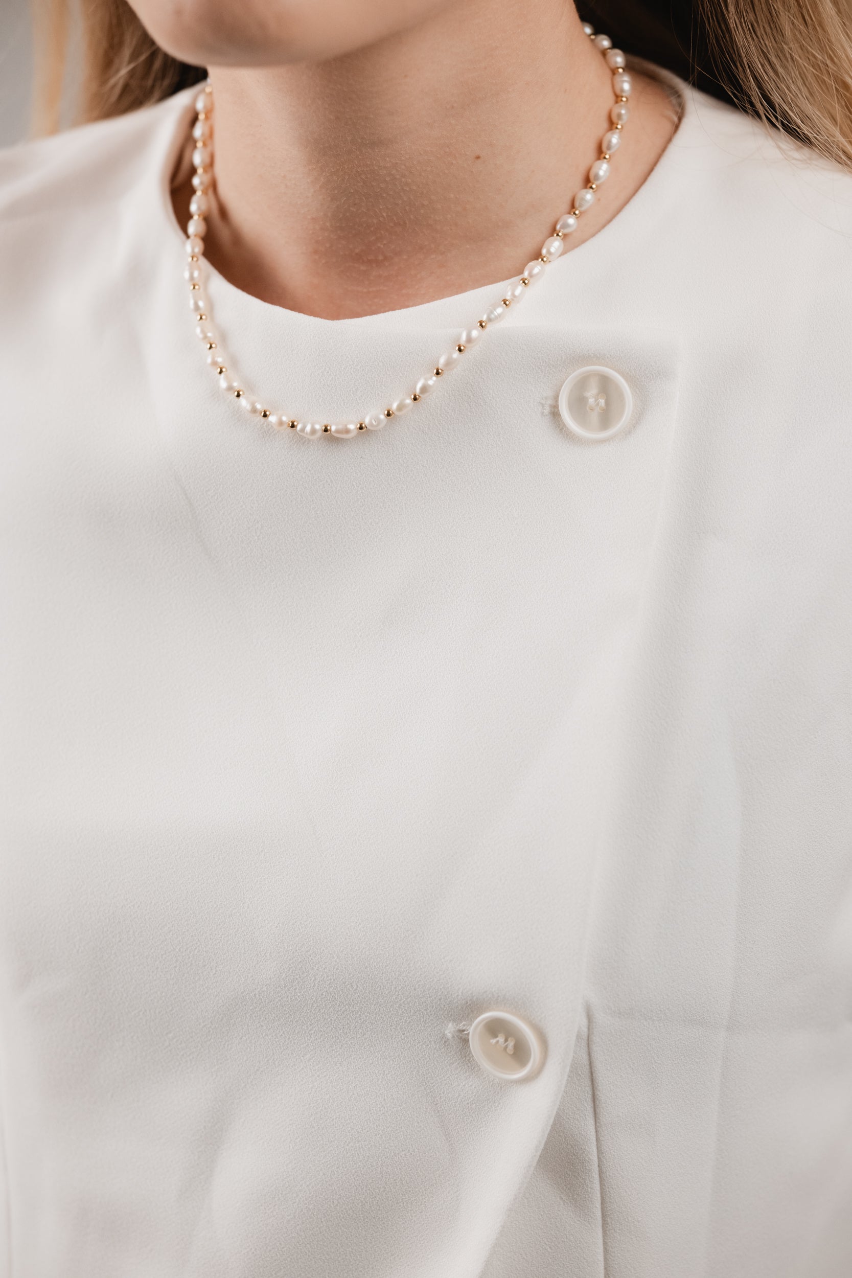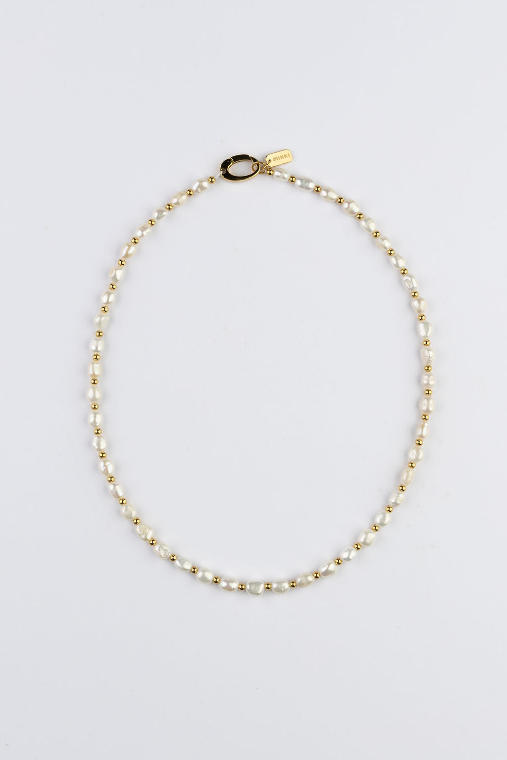 The Charley Necklace features a delicate strand of freshwater pearls, elegantly spaced with small gold beads that add a refined contrast. This harmonious blend of classic pearls and golden accents lends a modern touch to its timeless design. Versatile and effortlessly chic, this pearl and gold beaded necklace elevates any outfit, making it the perfect accessory for both every day and special occasions